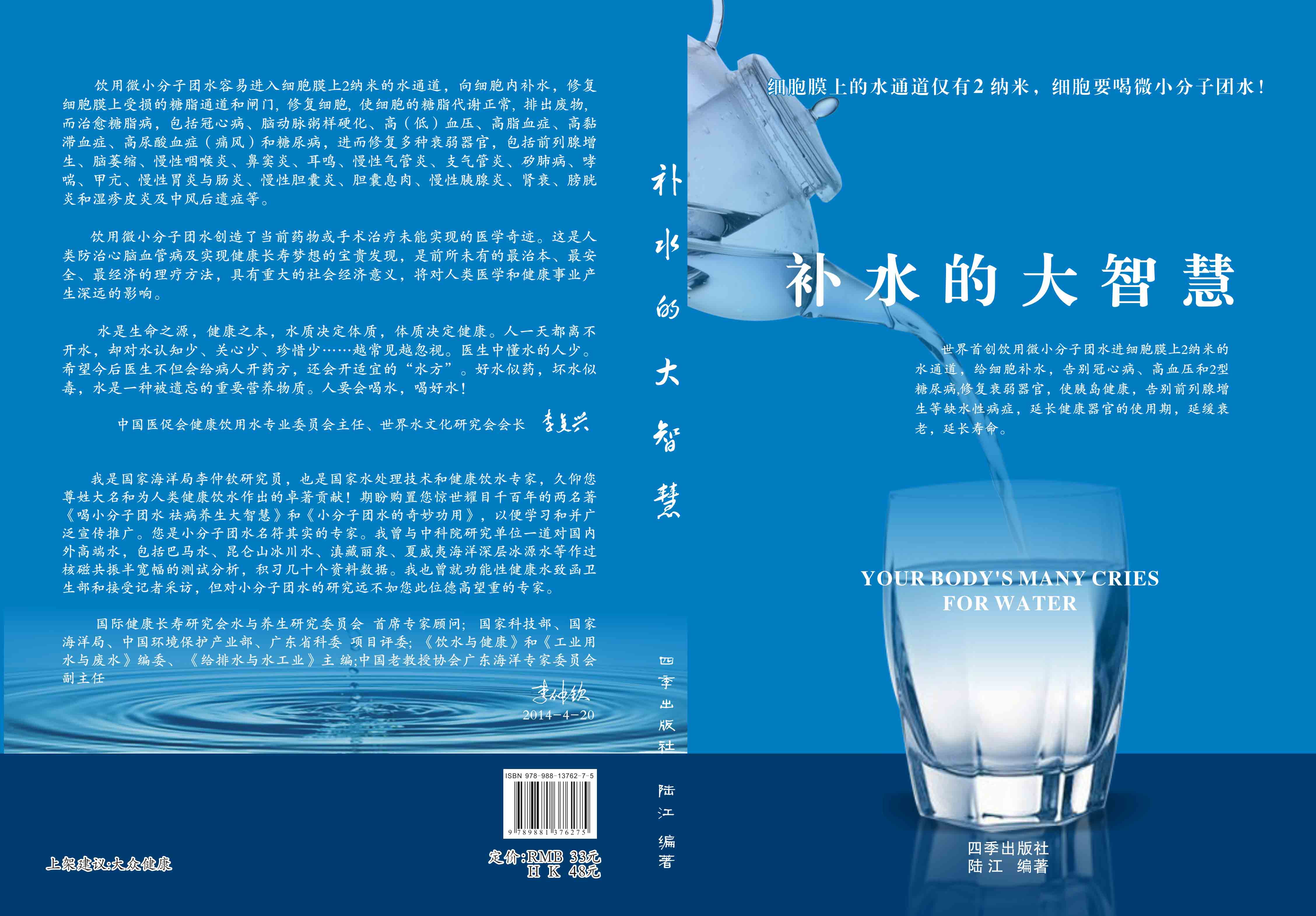 《補水的大智慧》,由陸冮編著,定價33元,四季出版社2014年10月出版,16開彩印內頁P224,書中有15年來代表性用戶的反饋。[企業文化]欄可下載最新書稿。